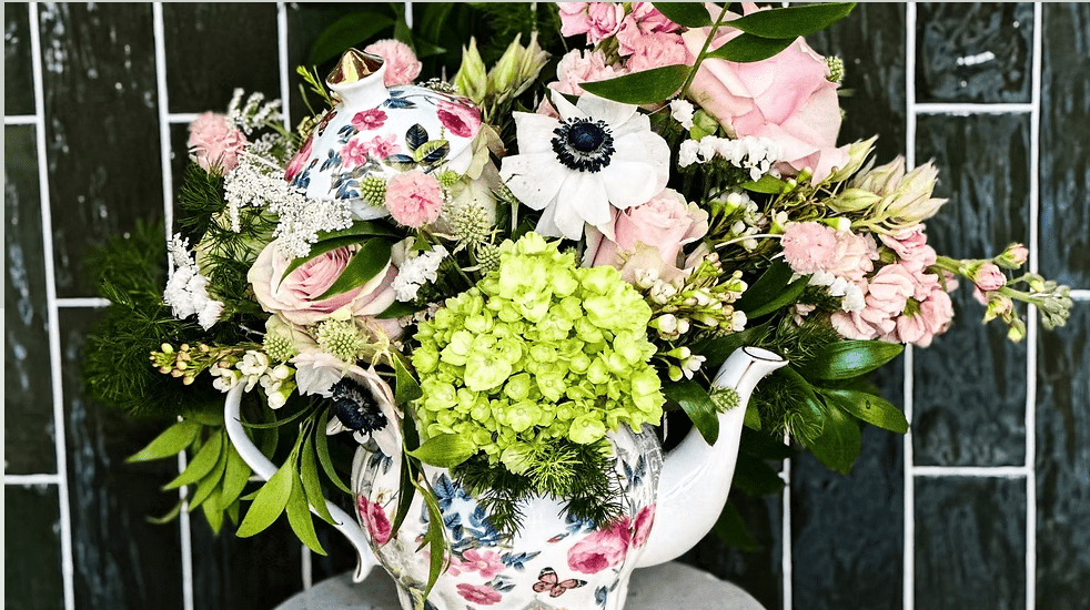 Create your own romantic flower arrangement inside a teapot vase—worthy of Lady Whistledown’s attention—while enjoying tea service and scones in true garden party fashion.