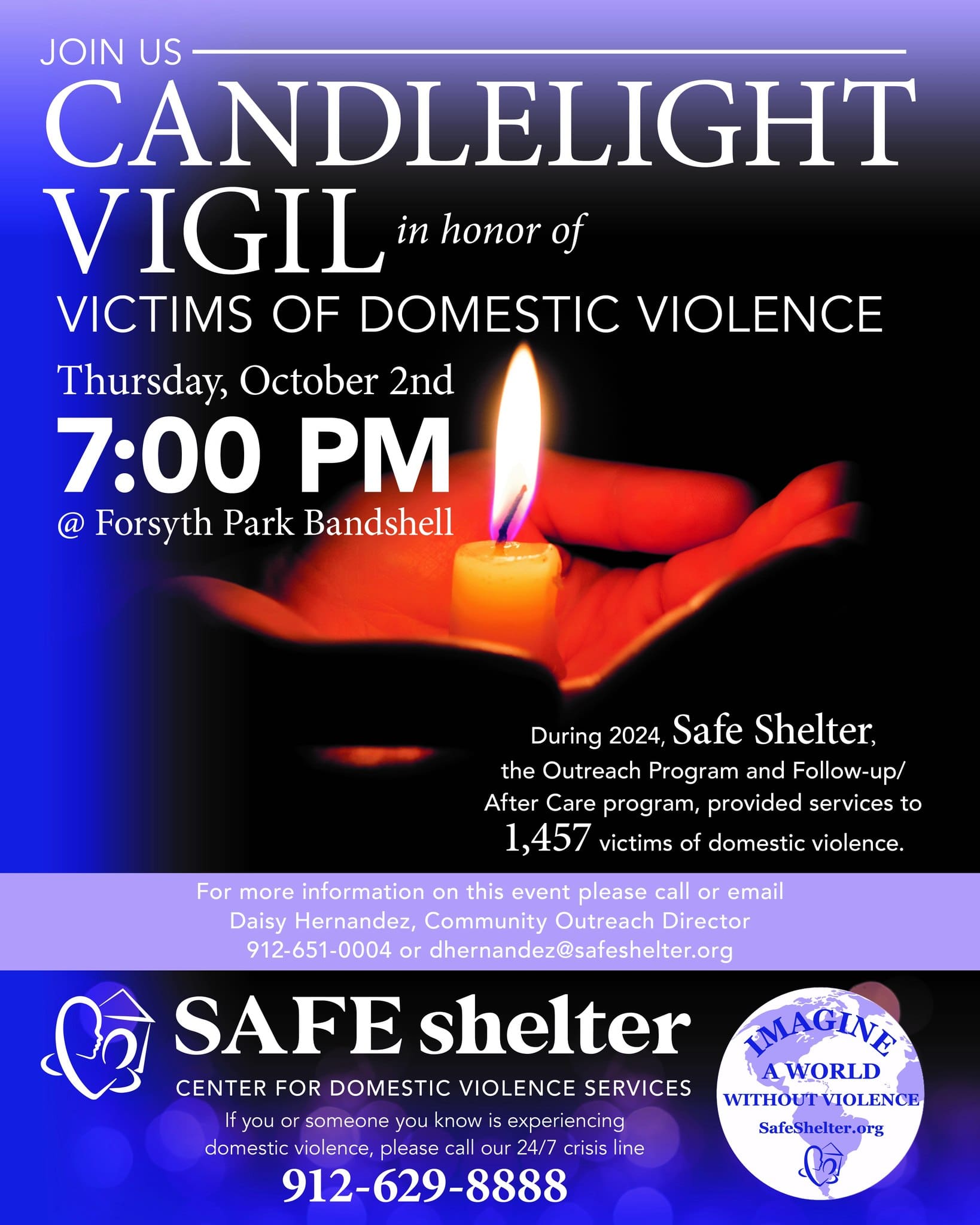 SAFE Shelter will host a candlelight vigil to honor and remember the lives lost to domestic violence. This solemn event offers an opportunity for reflection and unity. Together, the Savannah community will stand in solidarity with survivors, support grieving families, and renew its commitment to building a world free of violence.